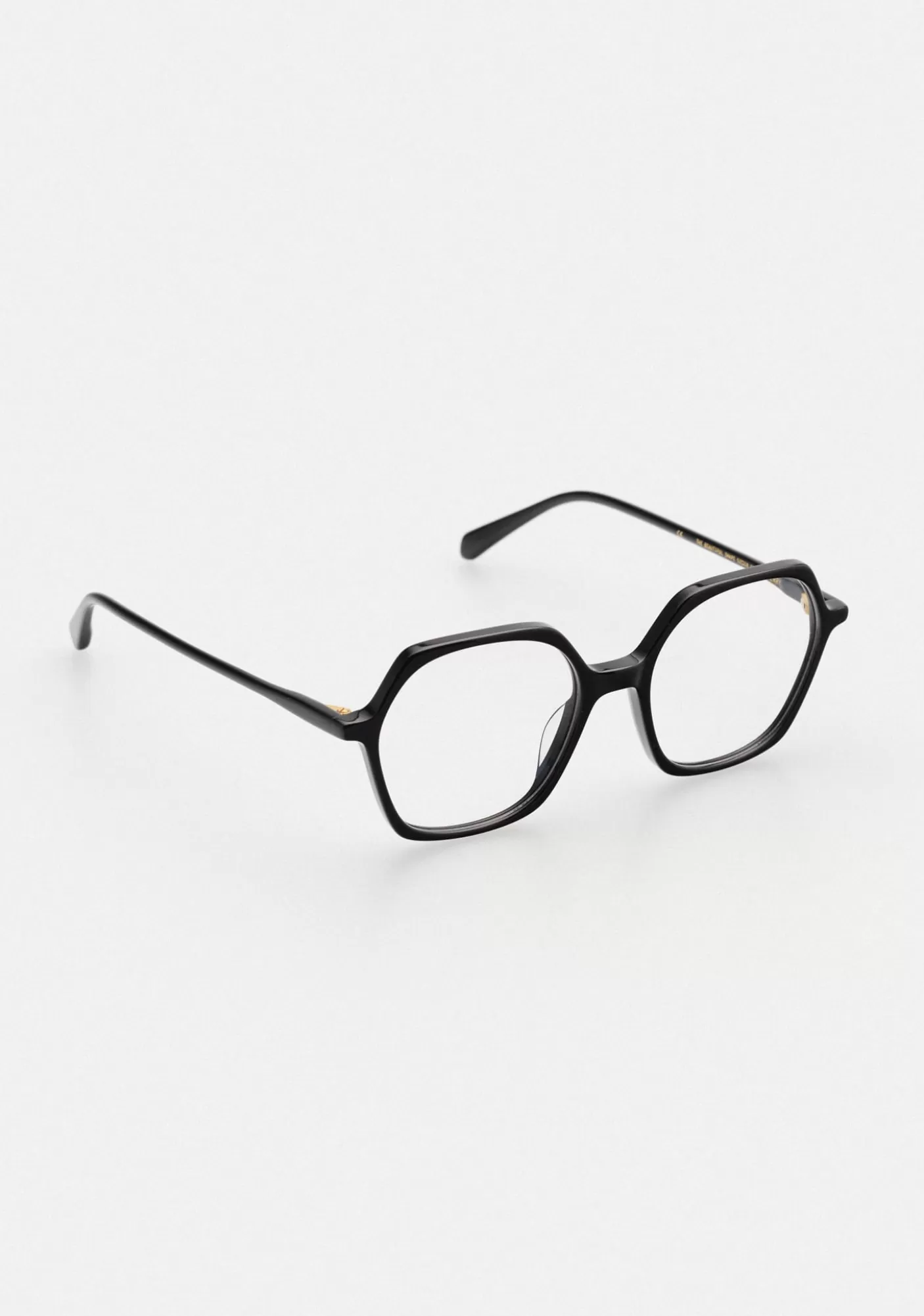 Gafa De Ver De Acetato Fino Monocolor Negro. Forma Hexagonal Ligeramente Oversize. Varillas De Acetato. Plaquetas De Acetato Incorporadas. Hecha A Mano.