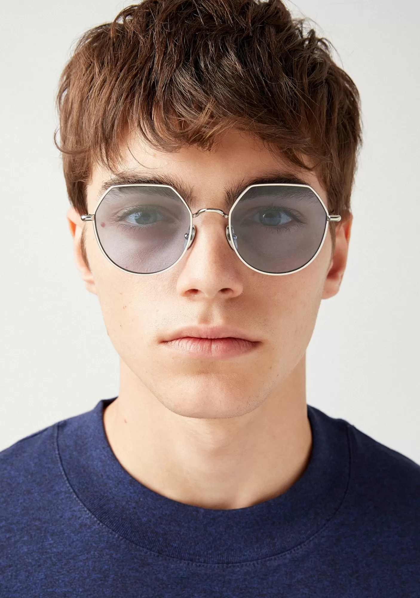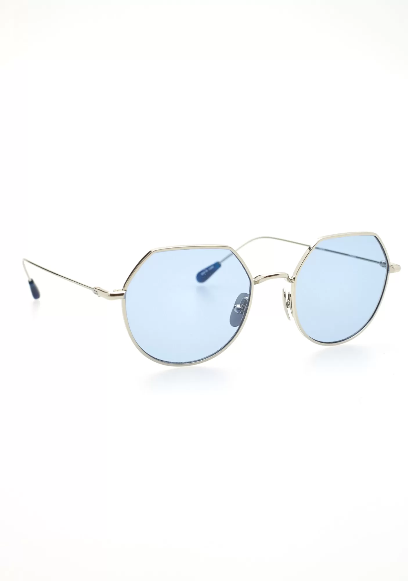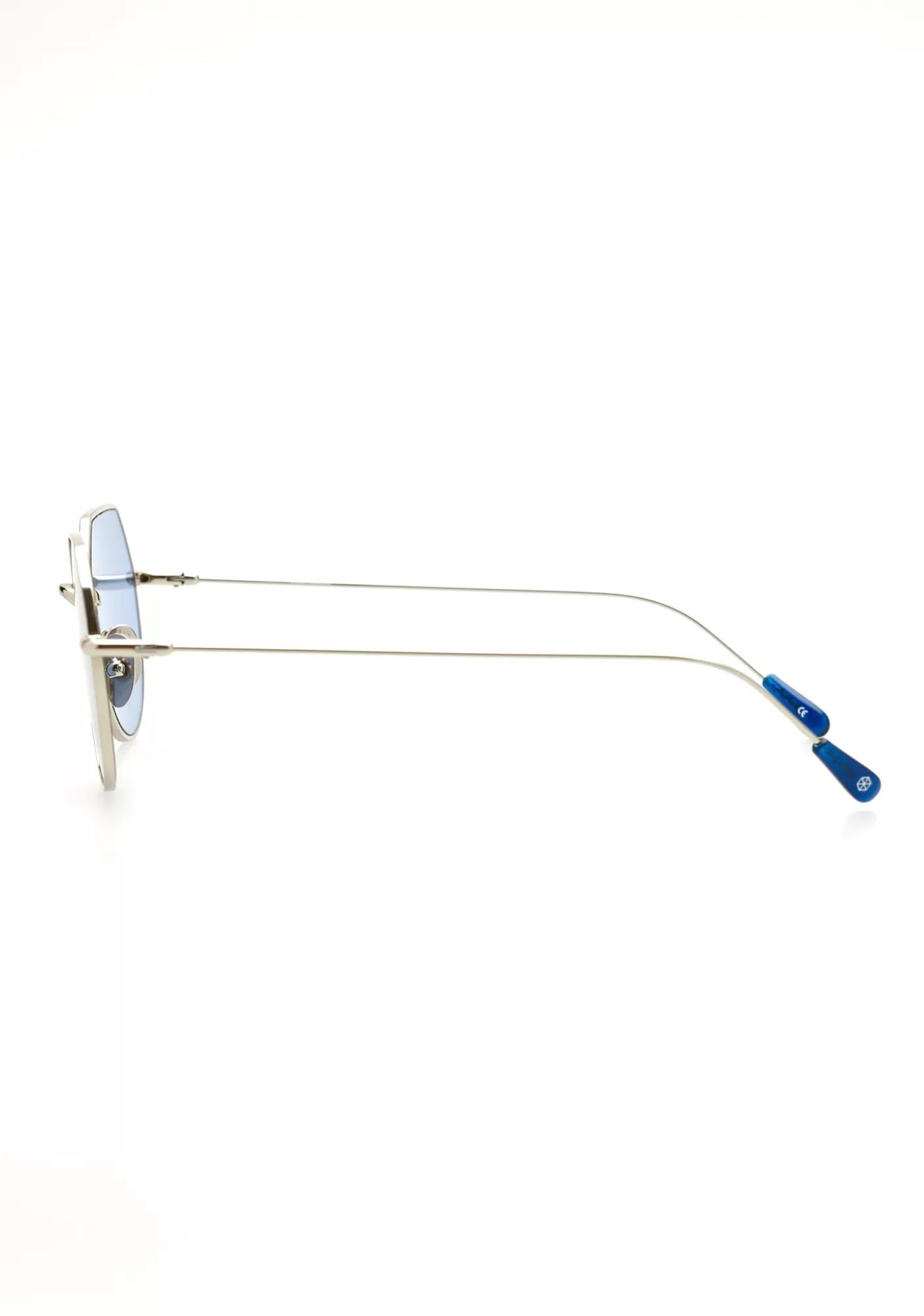 Gafa De Sol Con Ceja Plana De Titanio Plateado Tallado A Laser. Varillas De Titanio Con Terminal De Cerilla De Acetato. Lente Plana Azul Con 100% Proteccion Uv Y Tratamiento Anti-Reflejante. Plaquetas Ajustables De Titanio. Hecha A Mano.