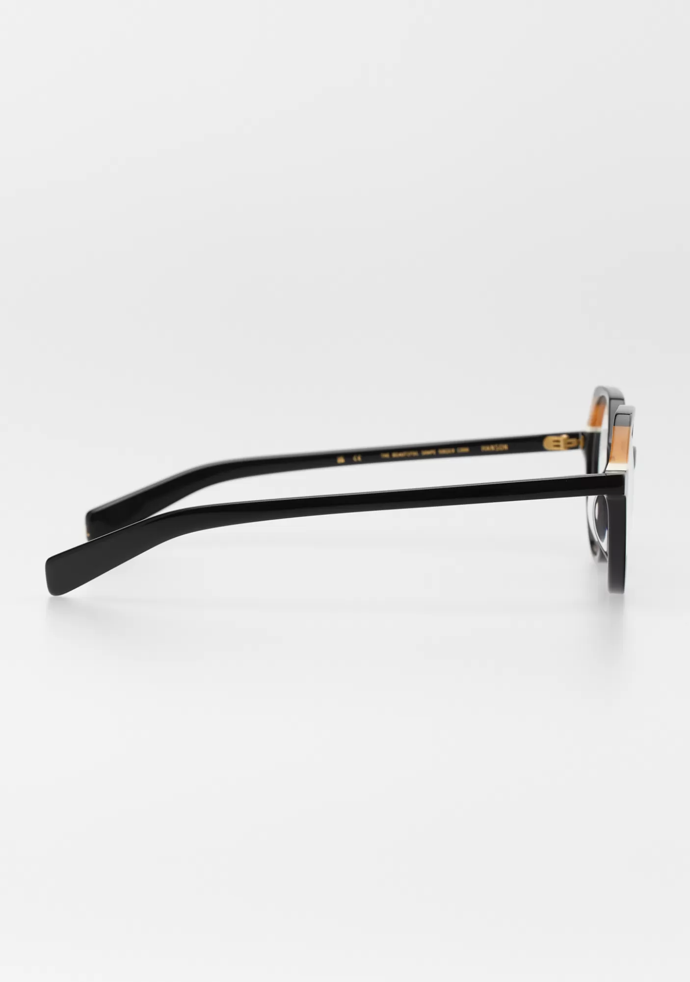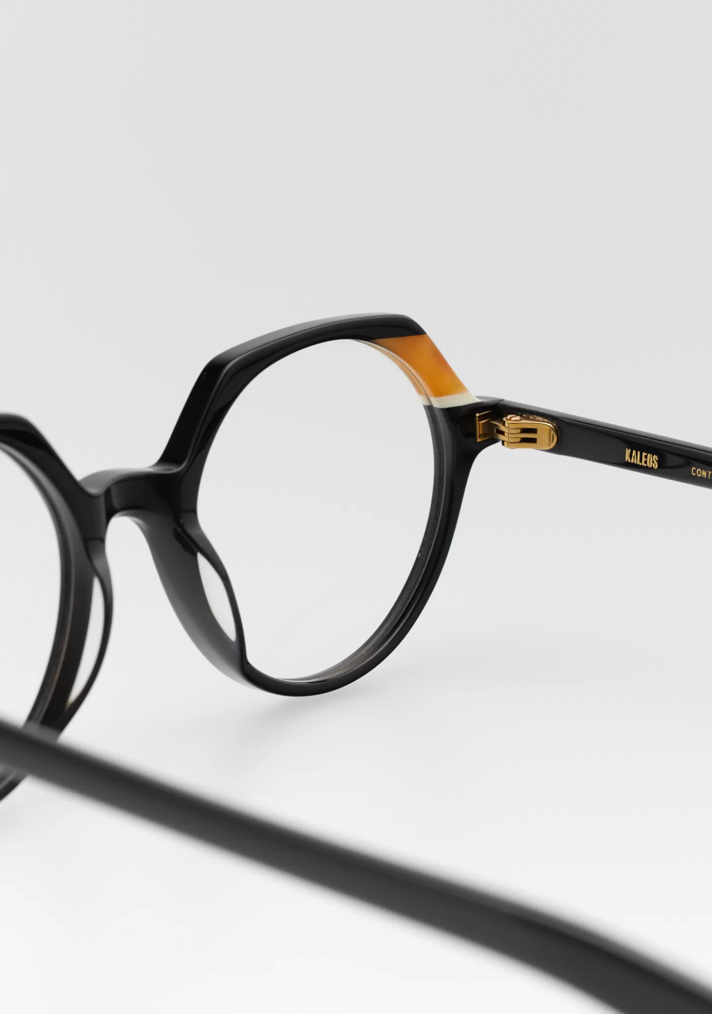 Gafa De Ver De Acetato Negro Con Doble Laminado En Havana Marron Claro Y Blanco. Forma Redondeada En La Parte Inferior Y Plana En La Parte Superior. Varillas De Acetato. Plaquetas De Acetato Incorporadas. Hecha A Mano.