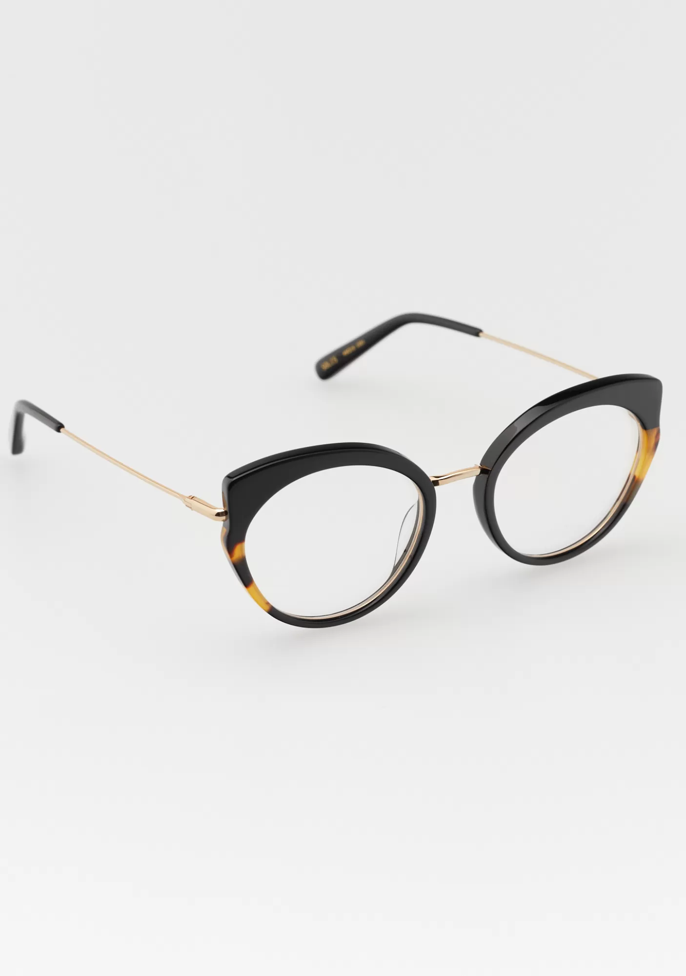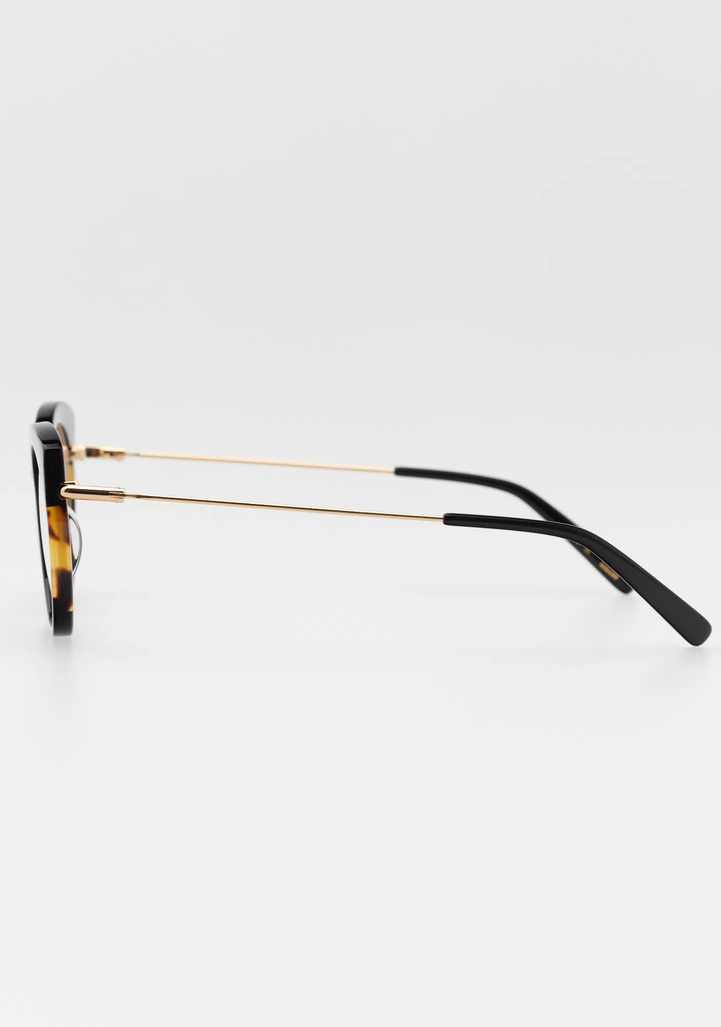 Gafa De Ver De Acetato Negro Con Laminado Havana Marron. Puente Dorado De Acero Inoxidable. Forma De Mariposa. Varillas De Acero Inoxidable Con Terminal De Acetato. Plaquetas De Acetato Incorporadas. Hecha A Mano.